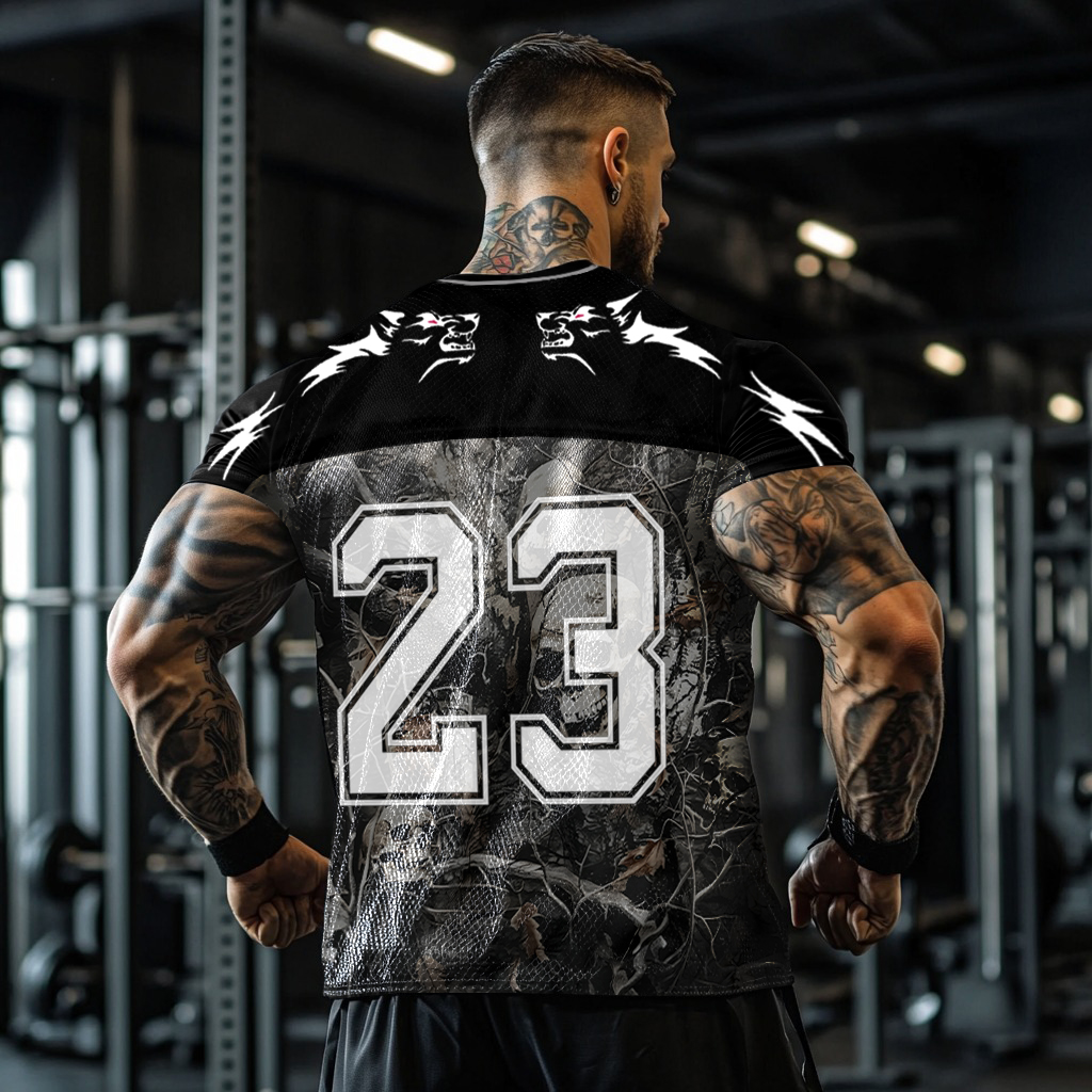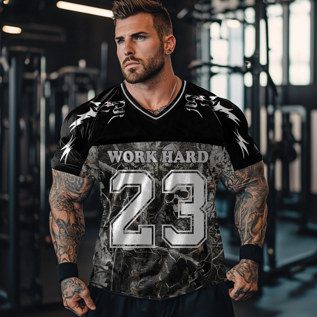 No.23 Work Hard Wolf Totem Skull Camouflage Graphics Gym Blokecore Blokette Jerseyfit V-neck T-shirt