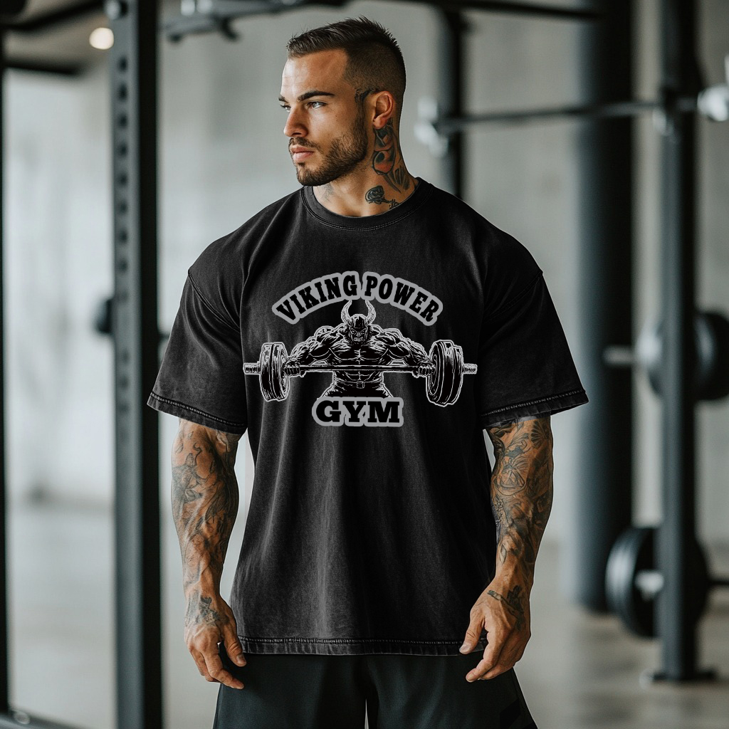 Gym Viking Warrior Runes Flame Graphic Washed Cotton T-shirt