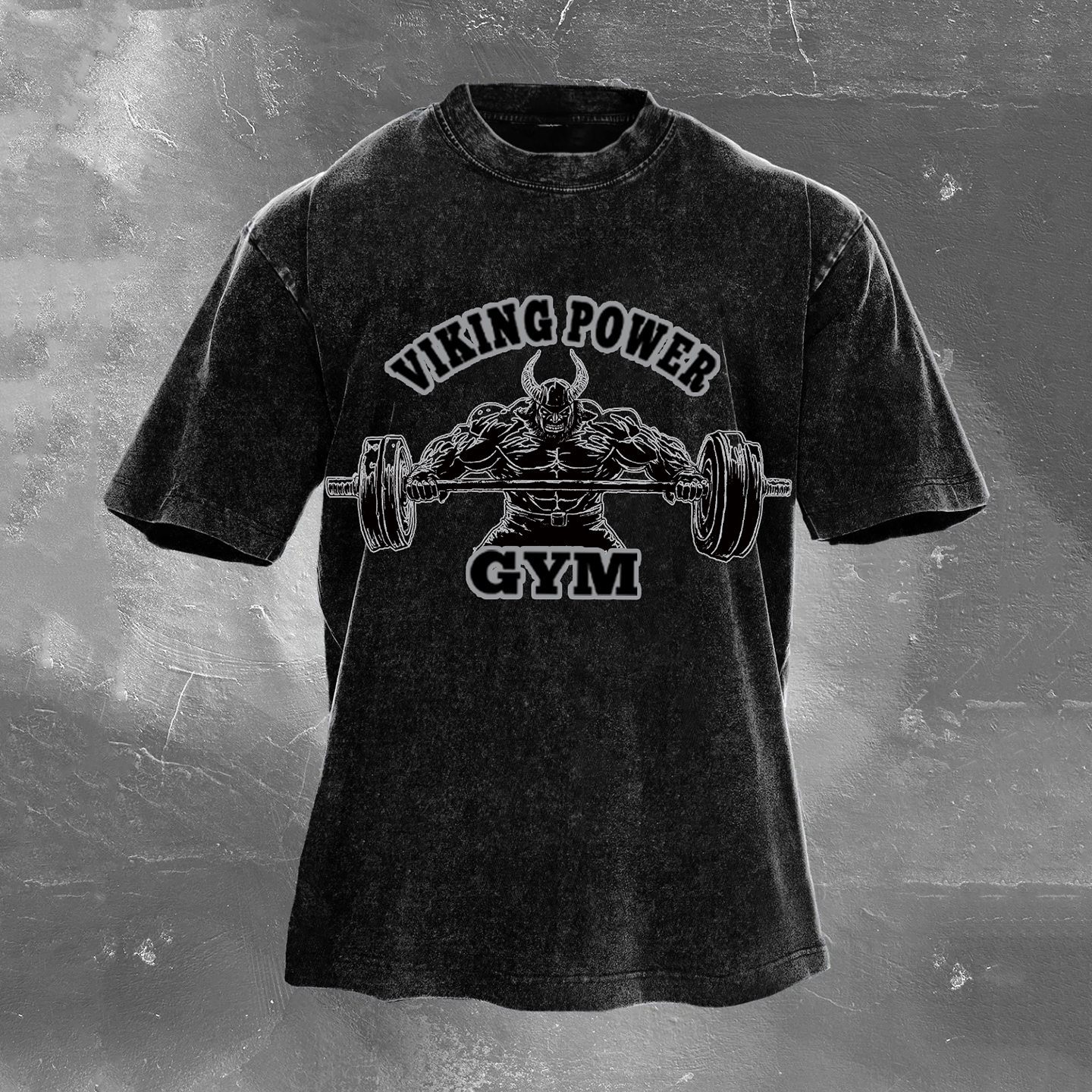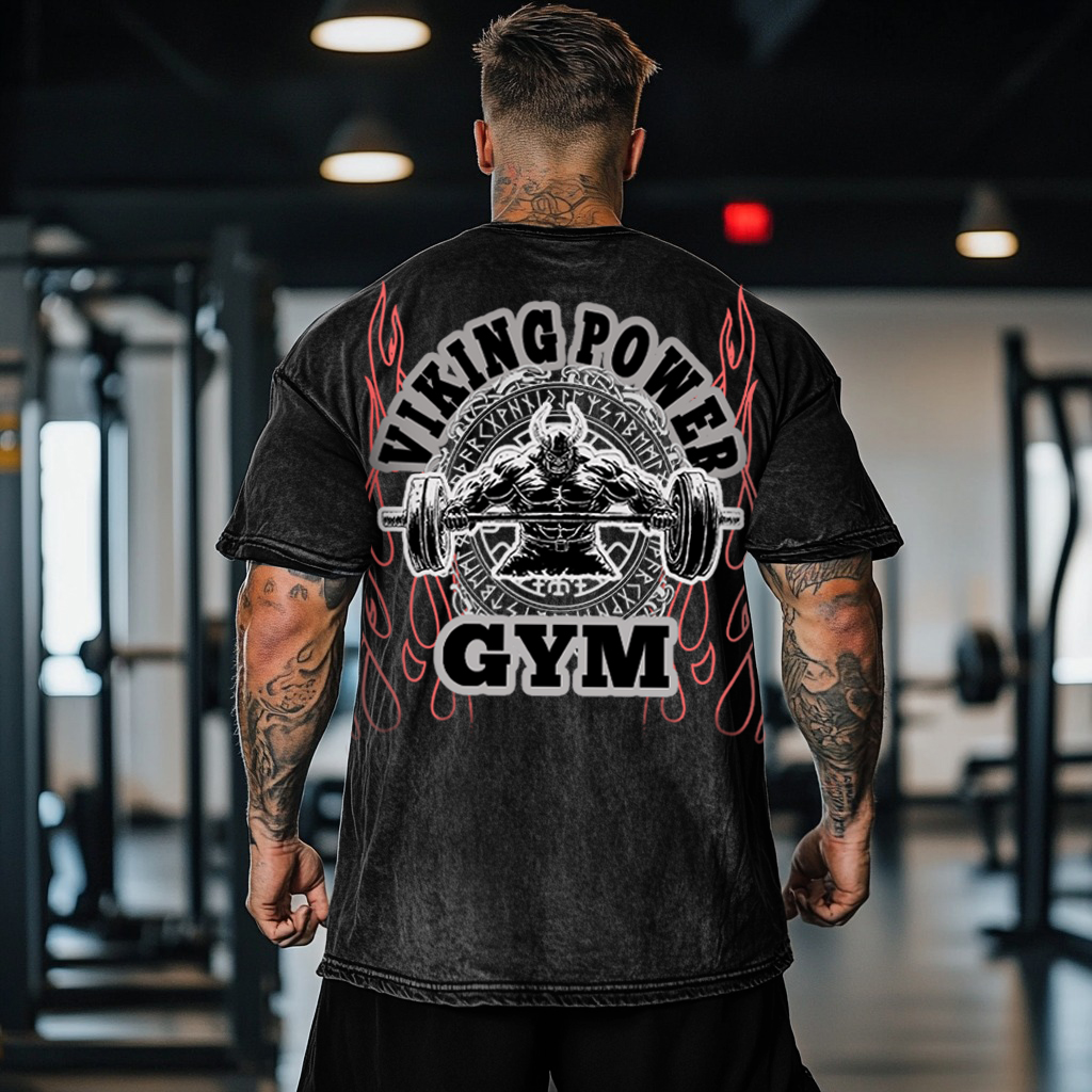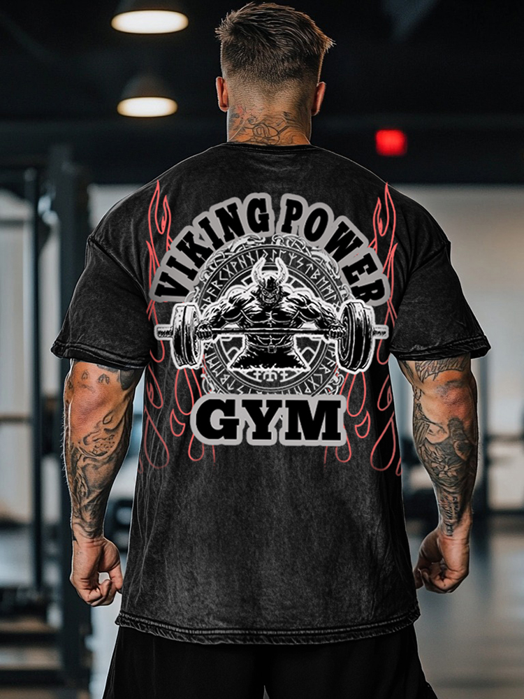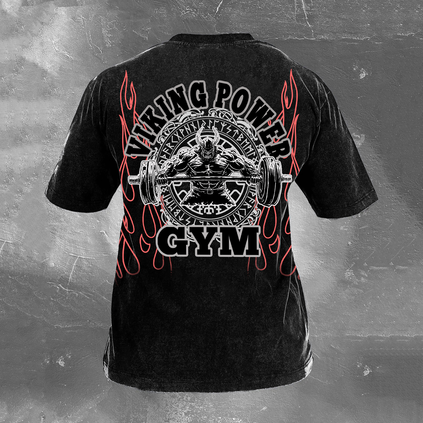 Gym Viking Warrior Runes Flame Graphic Washed Cotton T-shirt