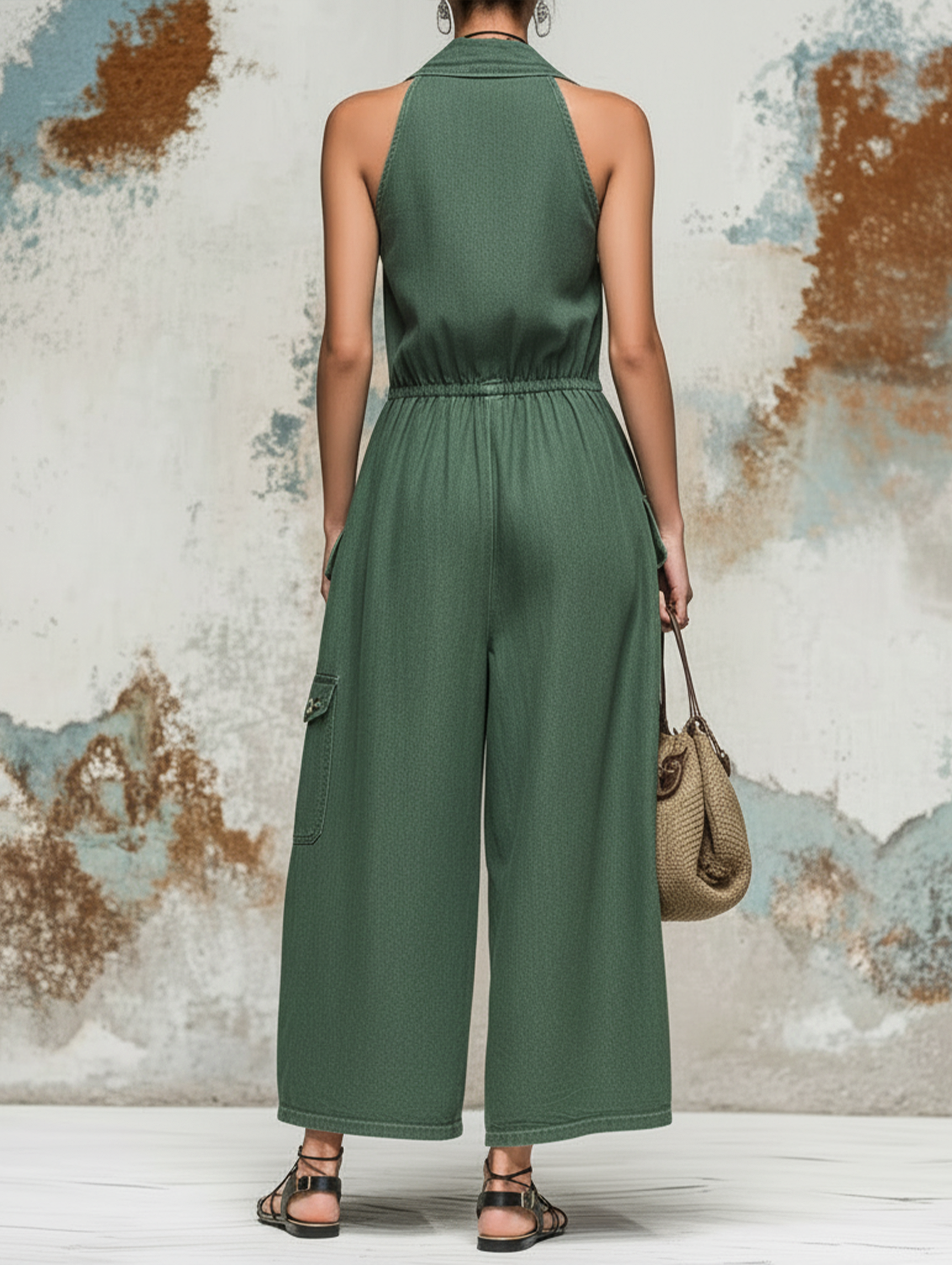Vintage Washed Green Halter Utility Denim Jumpsuit