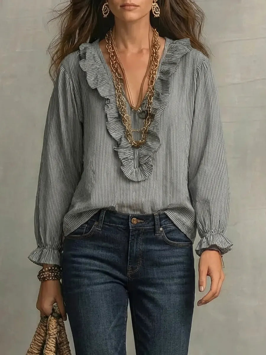 Women's Retro Striped Ruffled Stylish Casual Cotton Linen Shirt