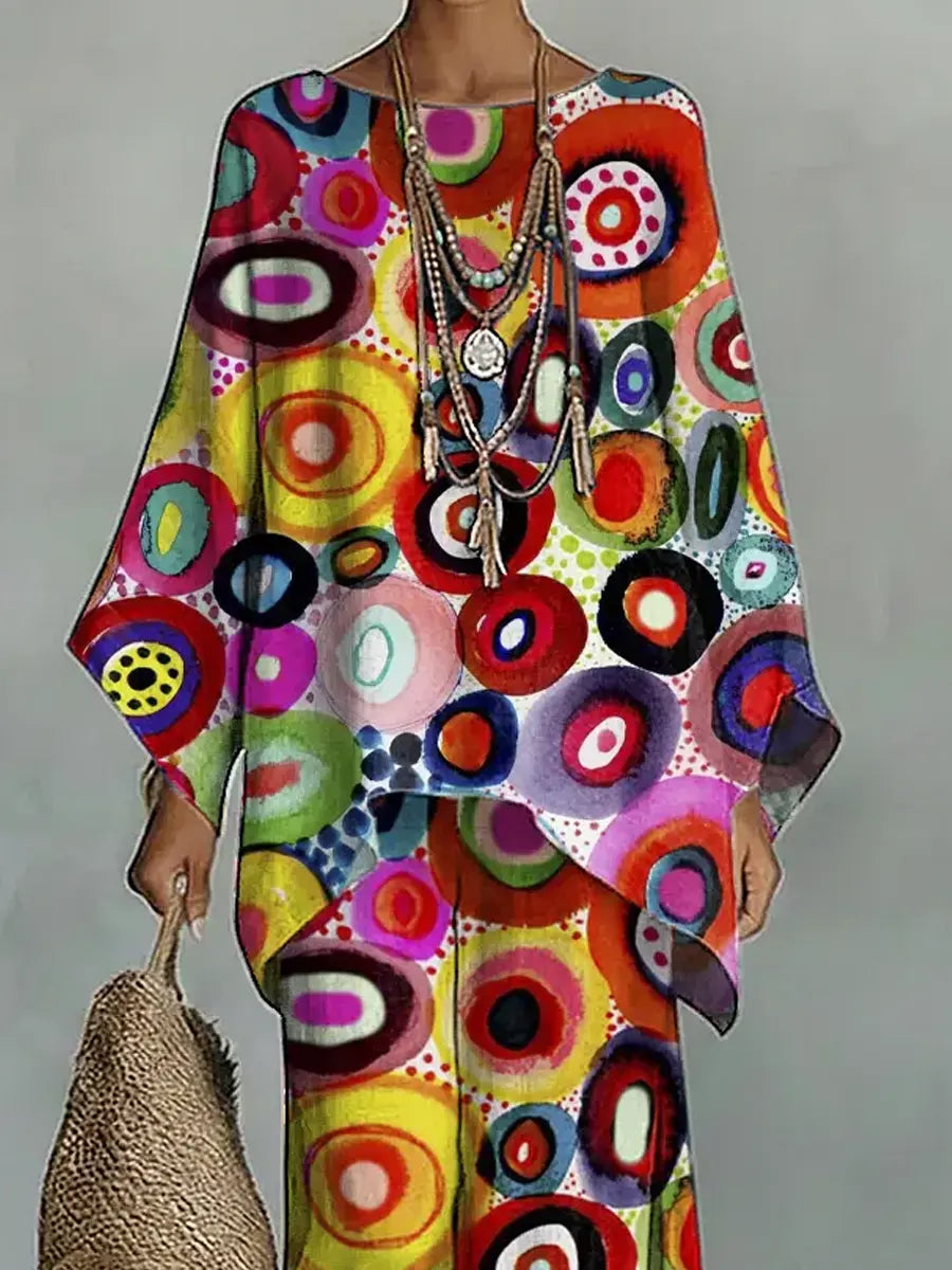 Women's Vintage Geometric Art Comfortable Loose Cotton Linen Wide-leg Pants Two-piece Set