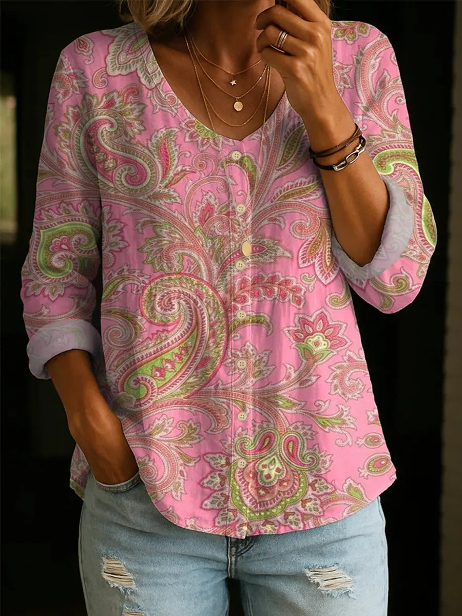 Women's Vintage Floral Pattern Art Print Casual Cotton Linen Shirt
