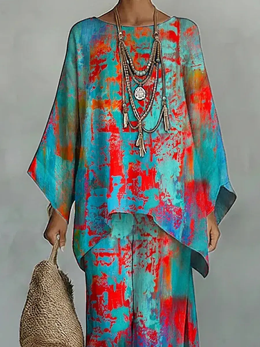 Women's Abstract Art Comfortable Loose Cotton Linen Wide-leg Pants Two-piece Set